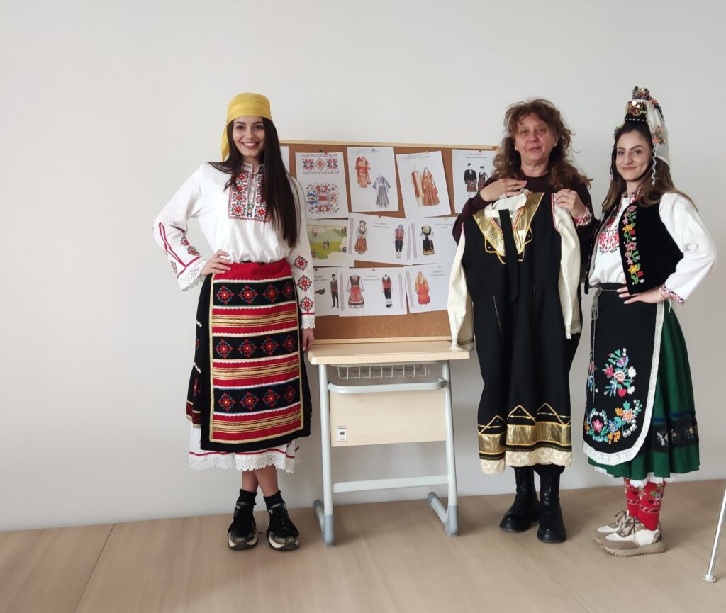 По време на часа децата се запознаха с основните фолклорни области на България и характерните елементи и цветове на мъжката и женската носия за всяка от тях. С интерес учениците разгледаха представените автентични женски носии от Шопската, Северняшката и Тракийската област.