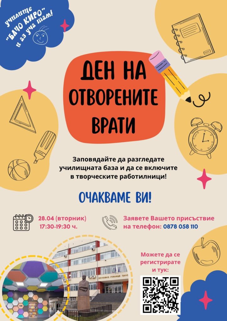 На 28.04 (вторник), от 17:30 – 19:30 ч. Ви каним на „Ден на отворените врати“. Елате да разгледате базата, да се включите в творчески работилници и да усетите духа на общността, в която Вашето дете ще расте и учи.