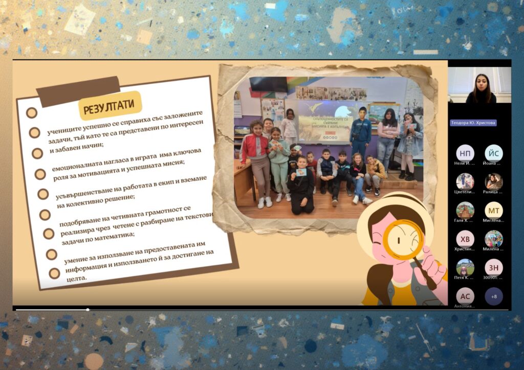 В продължение на четирите етапа на обучение, участниците преминаха от теоретичните основи на геймификацията до практическото създаване и прилагане на иновативни учебни ресурси. Основният акцент беше върху промяната в ролята на учителя – от източник на знания към фасилитатор и ментор, насочващ учениците да мислят критично, да развиват уменията им за четивна грамотност, творческо мислене и вземане на решения. Учителите се обучаваха да използват платформи като Genially, Wordwall и Canva за създаване на интерактивни Escape Room загадки и куизове.