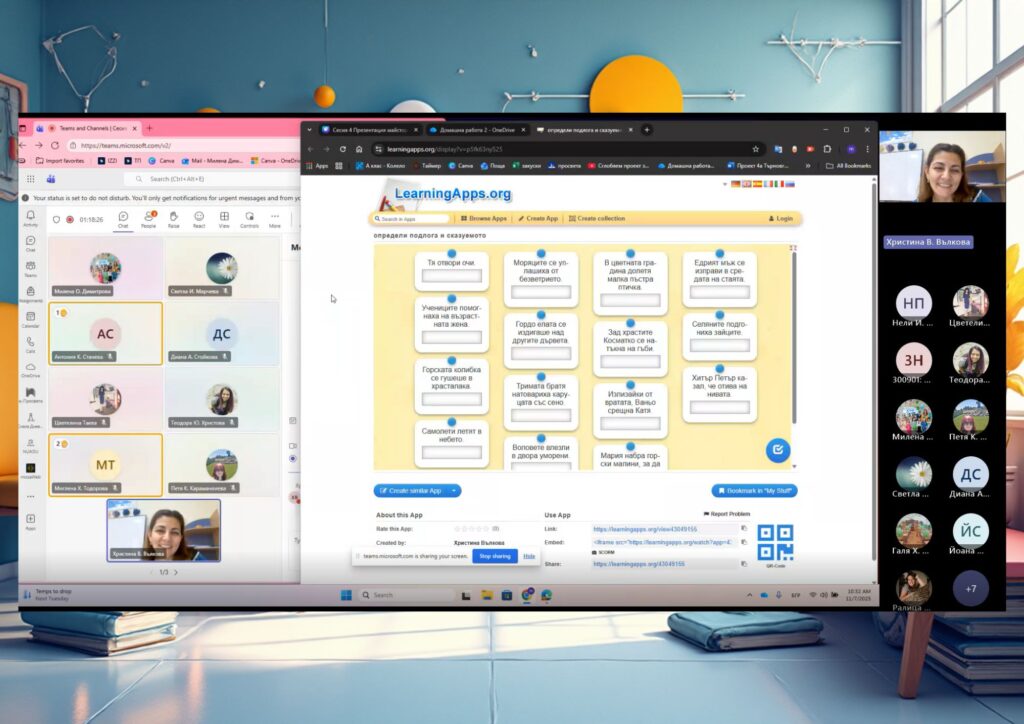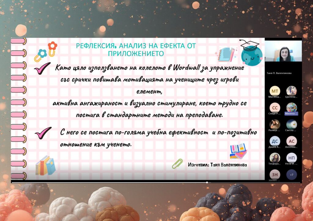 Днешната финална сесия беше посветена на споделянето на авторски ресурси. По време на срещата всеки участник представи своя създаден и приложен в реалната класна стая ресурс. Наблюденията, които учителите анализираха от приложението на образователни ресурси по демонстрираните методи, показаха повишена мотивация, по-висока концентрация и ангажираност сред учениците.
