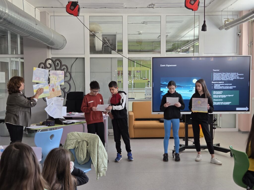 По-големите ученици впечатлиха гостите с бинарния урок по изобразително изкуство и български език и литература „Пътят към STREAM: Думите рисуват, цветовете разказват“. Петокласниците, под напътствията на г-жа Боряна Христова и г-жа Таня Стефанова, превърнаха текста в картина. Използвайки уникални бои, извлечени от природни материали, те показаха, че всеки възприема света по неповторим начин, а обучението чрез преживяване води до по-дълбока ангажираност и въображение.