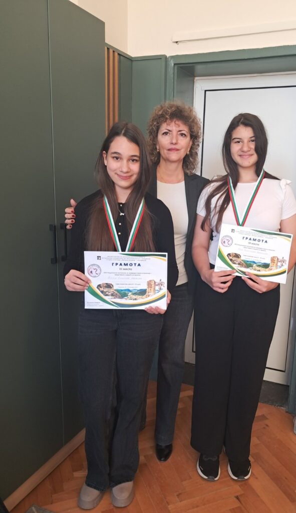 Емма Иванова и Ния Върбанова (VІІв клас) завоюваха трето място на ХХIІІ Национално състезание по природни науки и екология, провело се на 14 – 16 ноември, в гр. Кърджали, което е от графика на МОН за ученическите олимпиади и състезания. Двете ученички участваха със своя проект „Тайните на млечния протеин“, посветен на извличане на казеин от прясното и сухо мляко, неговата обработка с цел създаване на биопластмаса. Изследвани и сравнени бяха качествата на получения продукт по три различни технологии и определяне на областта на приложение на всяка от тях.