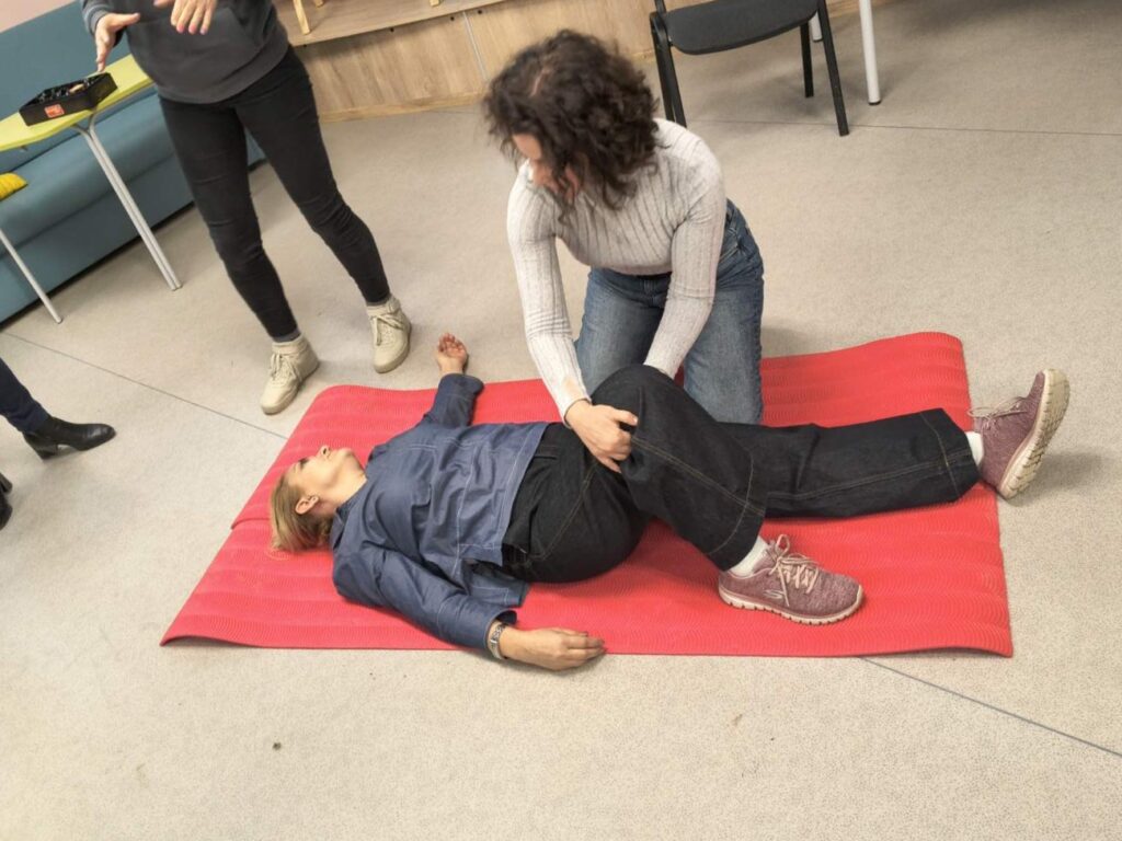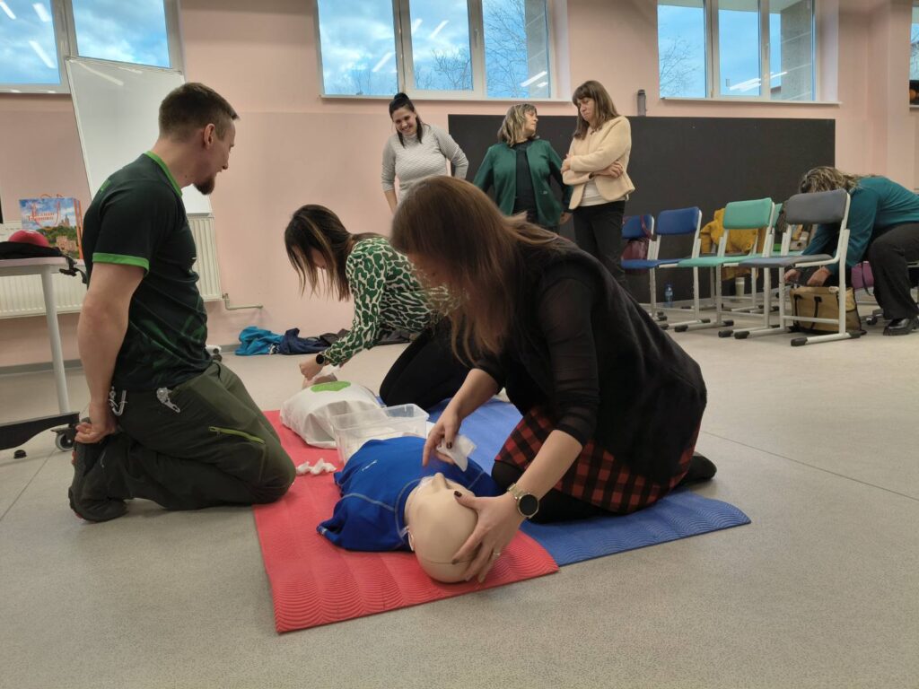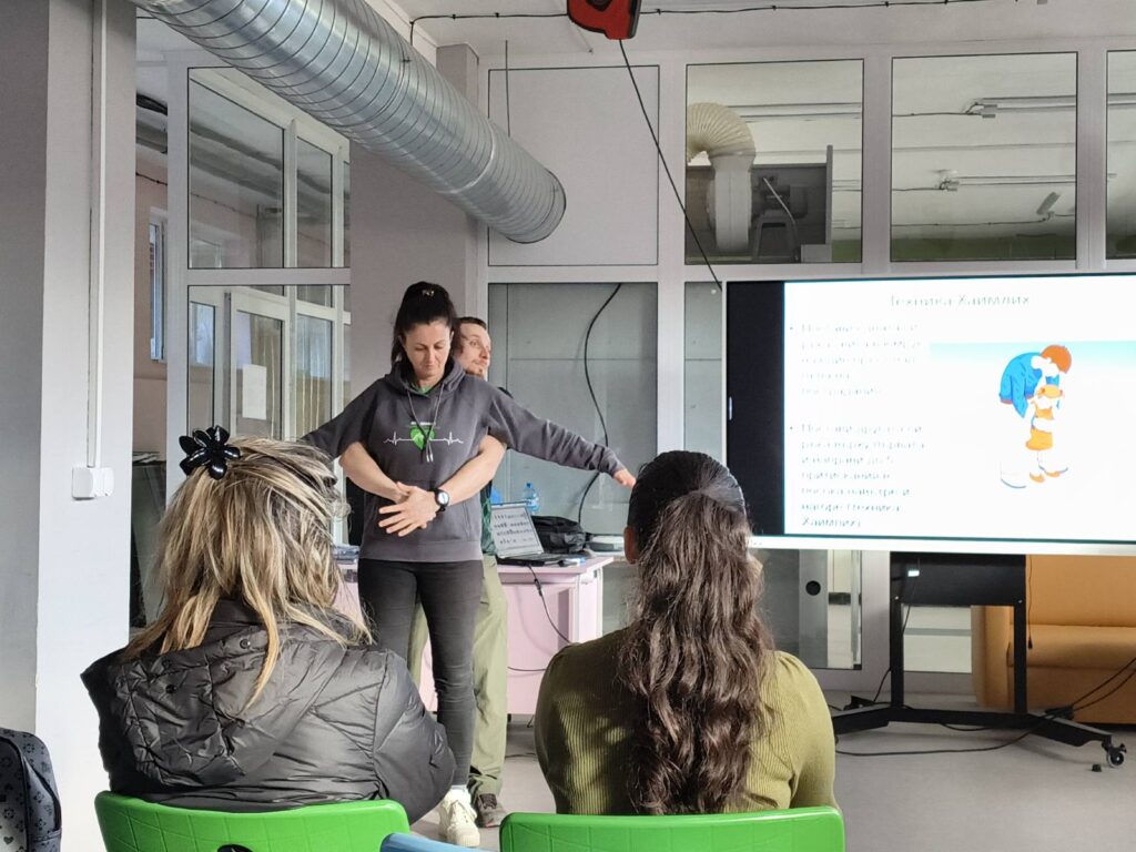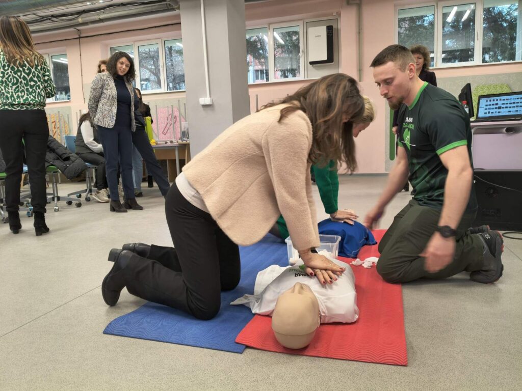 По време на практическото занимание учителите упражниха критично важни умения върху специални медицински манекени, както и един върху друг. Под ръководството на експертите, педагогическите специалисти тренираха техники за обдишване и извършване на сърдечен масаж. Програмата включваше и усвояване на практики за оказване на помощ при спешни състояния, свързани със спиране на кръвотечения чрез поставяне на превръзки и работа с турникет.