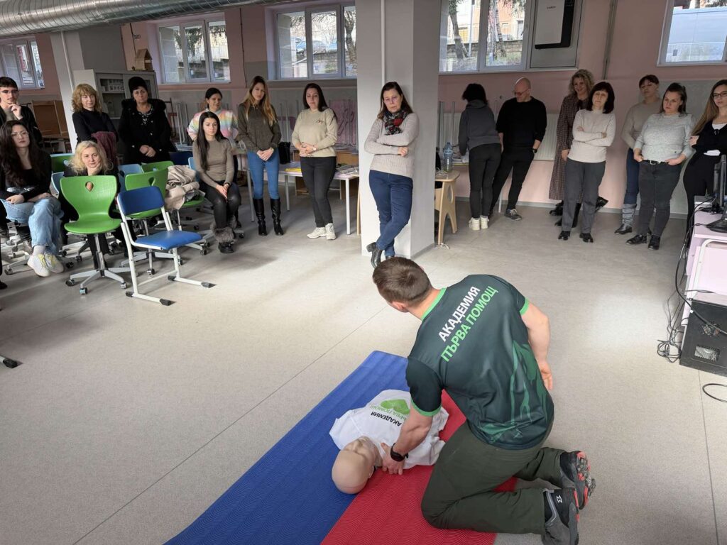 Днес в STEM центъра на училището се проведе интензивно обучение на тема „Първа долекарска помощ“, водено от лекторите Валентина Лекова и Петър Илиев от Сдружение „Академия Първа Помощ“. Обучението бе организирано в две сесии – сутрин и следобед, за да се даде възможност на колегите и от двете учебни смени да се включат активно.