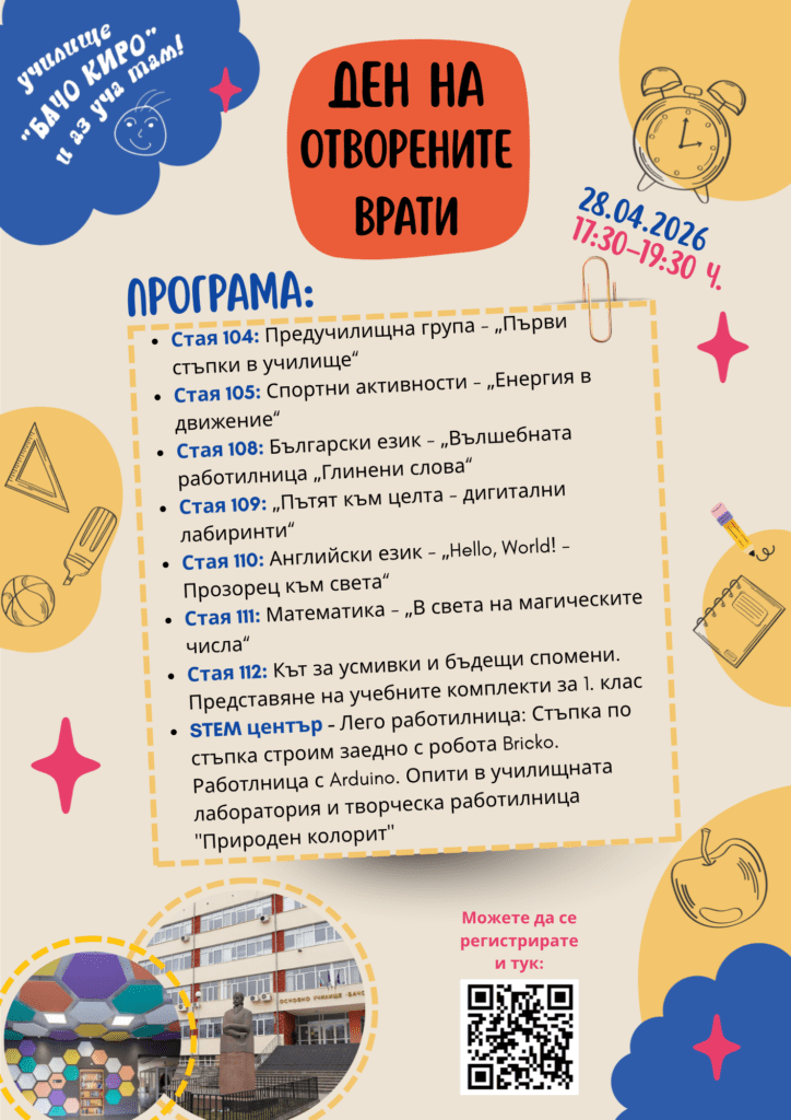 КонтактиНовиниНачало Училище За нас Дигитална визитка Летопис Алманах Патронен празник Ръководство Обществен съвет Свободни работни места Ученически парламент Училищно настоятелство STEM Иновации Документи Стратегия Планове Годишен план Защита при бедствия и аварии БДП Допълнителна подкрепа Дейността на педагогическия съветник Логопед Училищен психолог Годишен план ЕПЛР Делегиран бюджет Налагане на санкции и мерки на ученици Правила Пропускателен режим Освобождаване от ФВС Достъп до информация Безопасност в интернет Правилници Безопасни условия на обучение Вътрешен трудов ред Документооборот и информационно-деловодна дейност Етичен кодекс Правилник за дейността на училището Училищни учебни планове Механизъм превенции Противодействие на тормоза и насилието Сигурност и противодействие на тероризма Превенция на зависимости Лични данни Сигнали по ЗЗЛПСПОИН Закон за прилагане еврото в България Родители Дневен режим Обедно хранене Графици График на учебното време График на ГЦОУД Графици ДКРУ График консултации Графици дежурство на учители График писмени изпитвания /V – VII КЛАС/ Дневна организация ПГ Е-ЗАЯВЛЕНИЕ ЗА ОТСЪСТВИЯ ЗАЯВЛЕНИЕ ЗА ОТСЪСТВИЯ ПО СЕМЕЙНИ ПРИЧИНИ Допълнителна информация За предстоящата учебна година Необходими учебни помагала и пособия Книги за прочит през лятната ваканция За учениците Олимпиади Състезания НВО IV КЛАС VII КЛАС СФО Помагала Прием ПГ I клас Свободни места Програми и проекти Програма за ранно кариерно ориентиране ЕРАЗЪМ + Текущи проекти Приключили проекти Текущи национални програми Приключили национални програми Е-Дневник