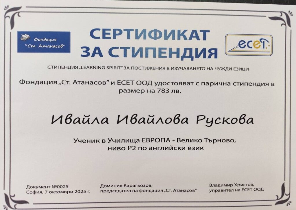 Стипендията, която покрива курс по английски език, се предоставя от нашите партньори Училища ЕВРОПА с подкрепата на Фондация “Ст. Атанасов” и ЕСЕТ ООД.