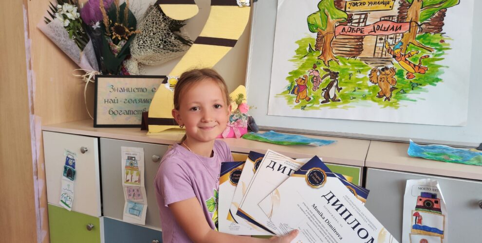 Моника Димитрова беше отличена за постигнати изключителни резултати на олимпиадите “КИНГС” в своята възрастова група. Тя беше наградена с диплом първа степен за участието си в олимпиадите по български език и литература, математика, човекът и природата и човекът и обществото. Моника е ученичка във IIв клас с класен ръководител Диана Чоканова